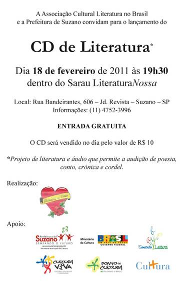 O lançamento do Cd de Literatura será dia 18 de fevereiro às 19:30 no Sarau Literatura Nossa na sede da Associação Cultural Literatura no Brasil, localizada à Rua Bandeirantes, 606 – Jd. Revista.